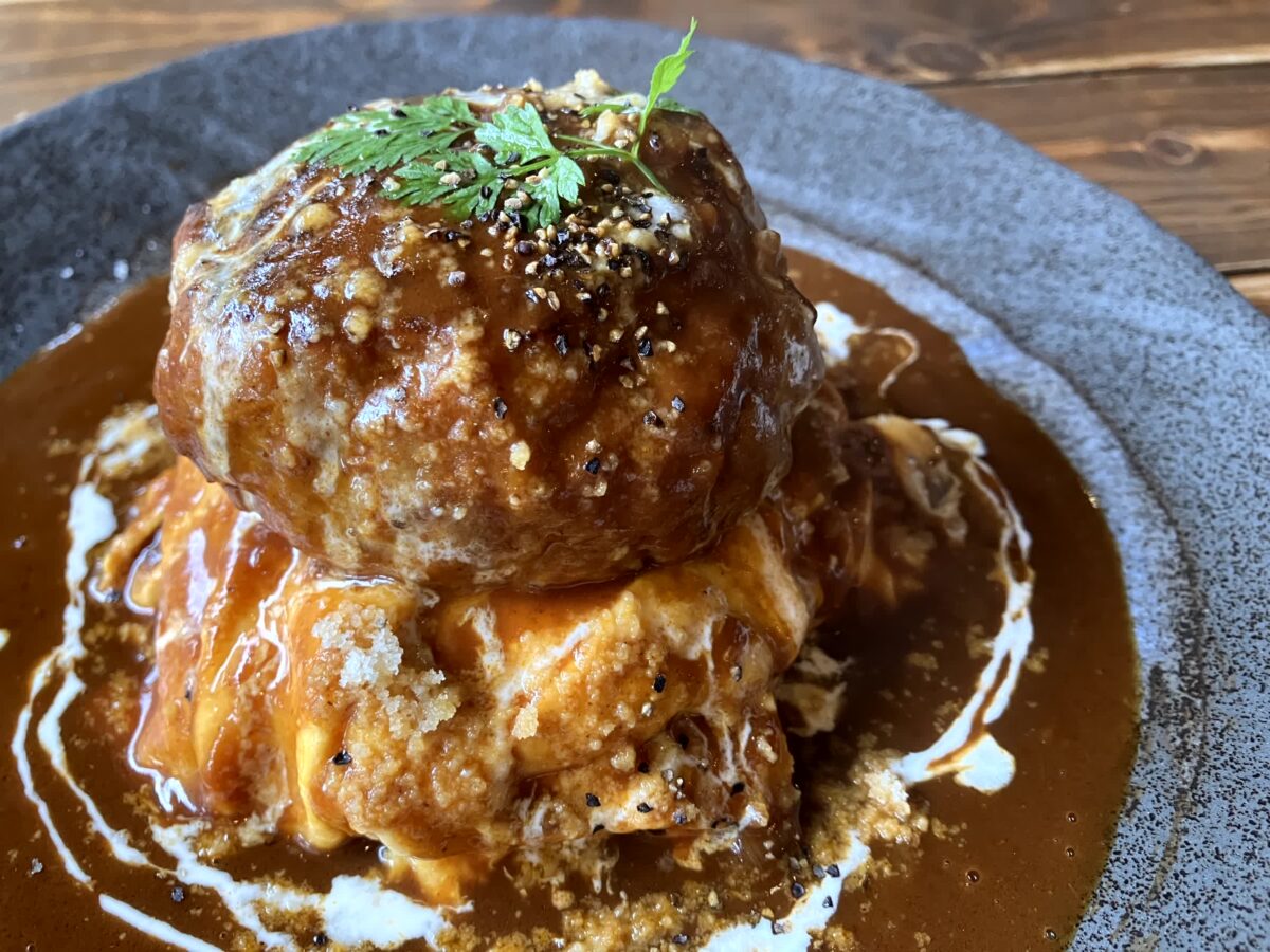 とろとろの卵に包まれたオムライスの上に、肉厚でジューシーなハンバーグがごろっと乗り、上からデミグラスソースがたっぷりとかけられています!